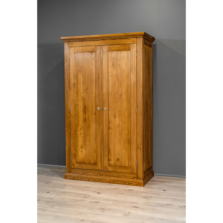 Ein Kleiderschrank mit zwei Türen und zwei Schubladen der Kollektion Simple, die sich durch schlichte Linie auszeichnet und mit oder ohne Einkerbungen verfügbar ist, ist ein Schrank mit Fächern, einer Kleiderstange und zwei Schubladen, die sich hinter den Türen befinden.