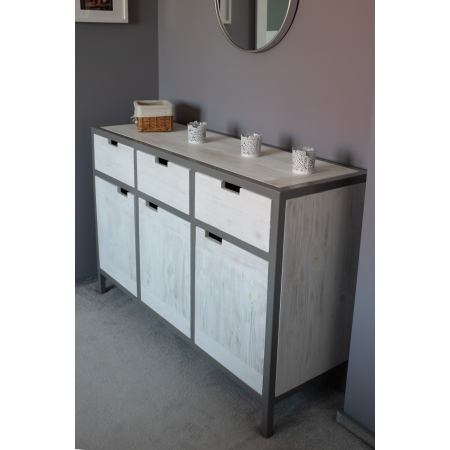 Sideboard klein im Industriedesign 3- türig 3 Schubladen massiv Kiefer in Kombination mit Metall