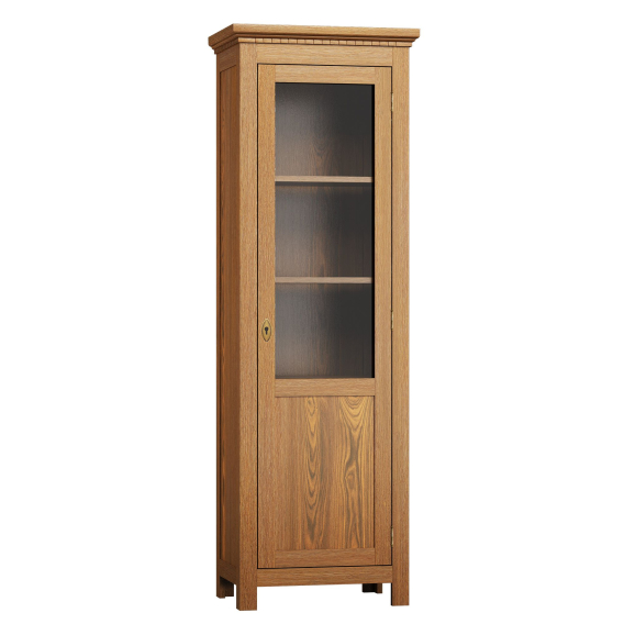 Eine Vitrine mit einer Glastür der Kollektion Simple, die sich durch schlichte Linie auszeichnet und mit oder ohne Einkerbungen verfügbar ist. Diese Vitrine ist je nach Wahl rechts- oder linksseitig.