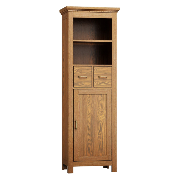 Ein Regal mit einer Tür (rechts- oder linksseitig), zwei Schubladen und zwei offenen Fächern der Kollektion Simple, die sich durch schlichte Linie auszeichnet und mit oder ohne Einkerbungen verfügbar ist.