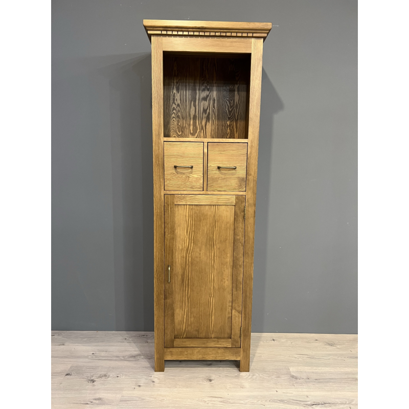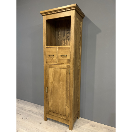 Ein Regal mit einer Tür (rechts- oder linksseitig), zwei Schubladen und zwei offenen Fächern...