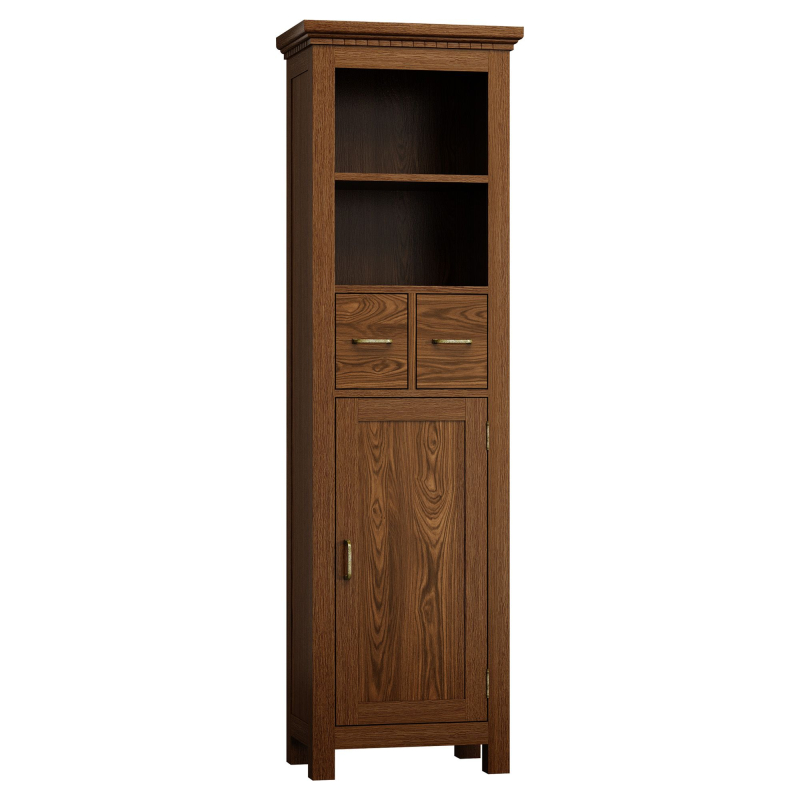 Ein Regal mit einer Tür (rechts- oder linksseitig), zwei Schubladen und zwei offenen Fächern der Kollektion Minor, die sich durch schlichte Linie auszeichnet und mit oder ohne Einkerbungen verfügbar ist.